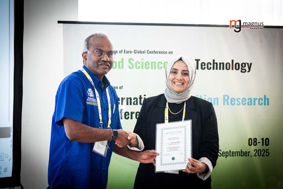 Kasiviswanathan Muthukumarappan felicitating Latife Cagla Coklar With Oral Presentation Certificate
