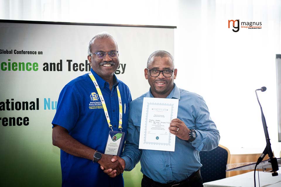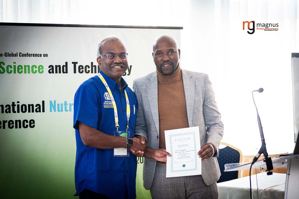 Kasiviswanathan Muthukumarappan felicitating Simphiwe Mhlontlo With Oral Presentation Certificate